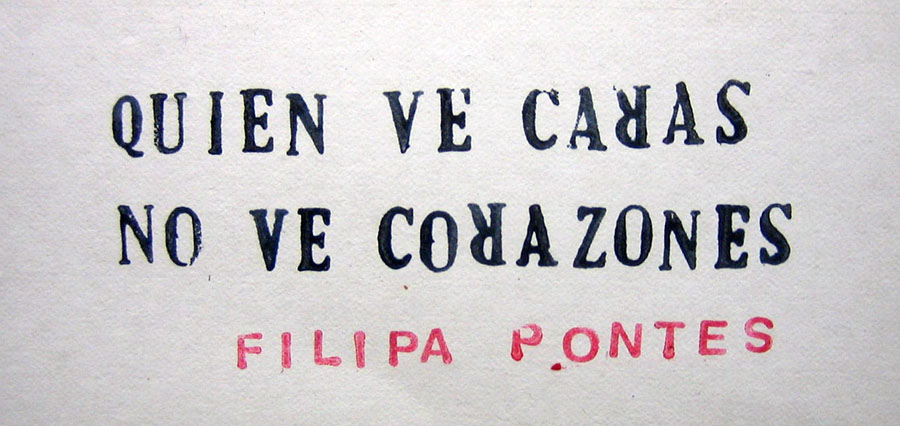 Evoking a Portuguese old proverb, QuienVeCarasNoVeCorazones/Who see faces, does not see hearts (2008) is an illustrated artwork about the human condition. Reflecting on the unequal opportunities in a globalized and multicultural society, it uses Barcelona as a reference. The work critically examines the discrimination related to immigration and gender issues. The installation consists of 10 individually framed drawings, metaphorically representing women around the world. Materials used include gel pens and stamps. Dimensions: 100 cm x 150 cm