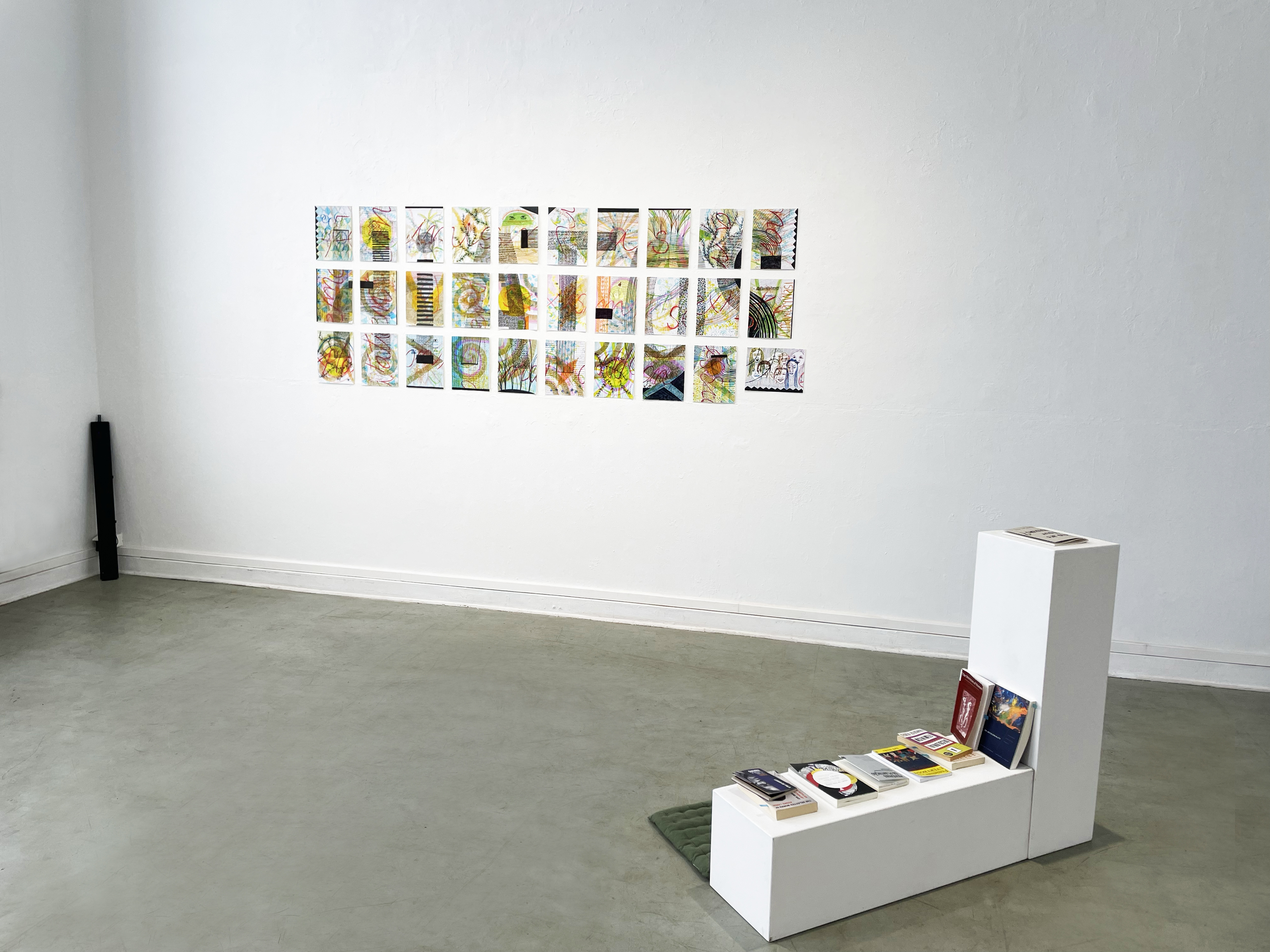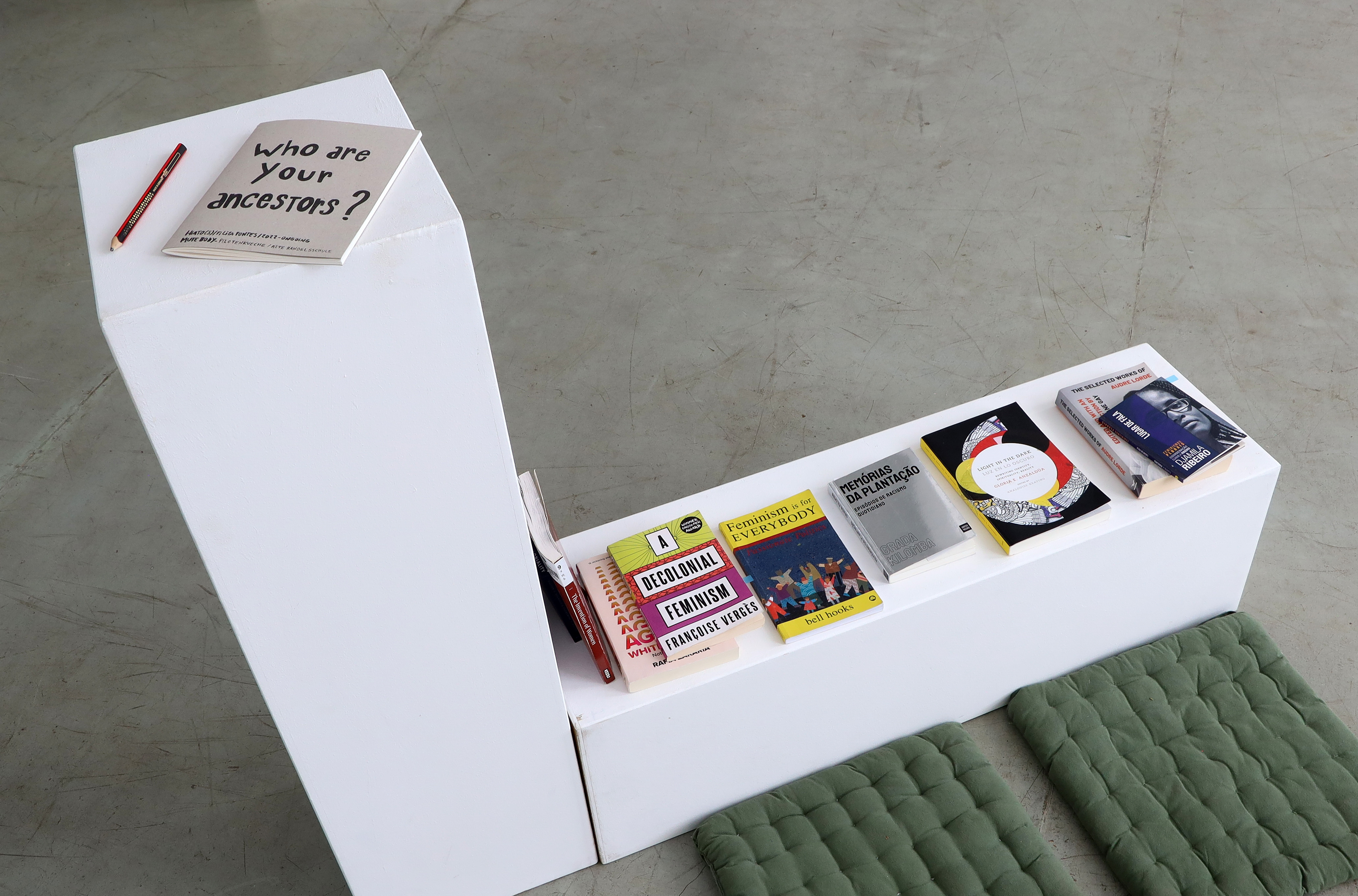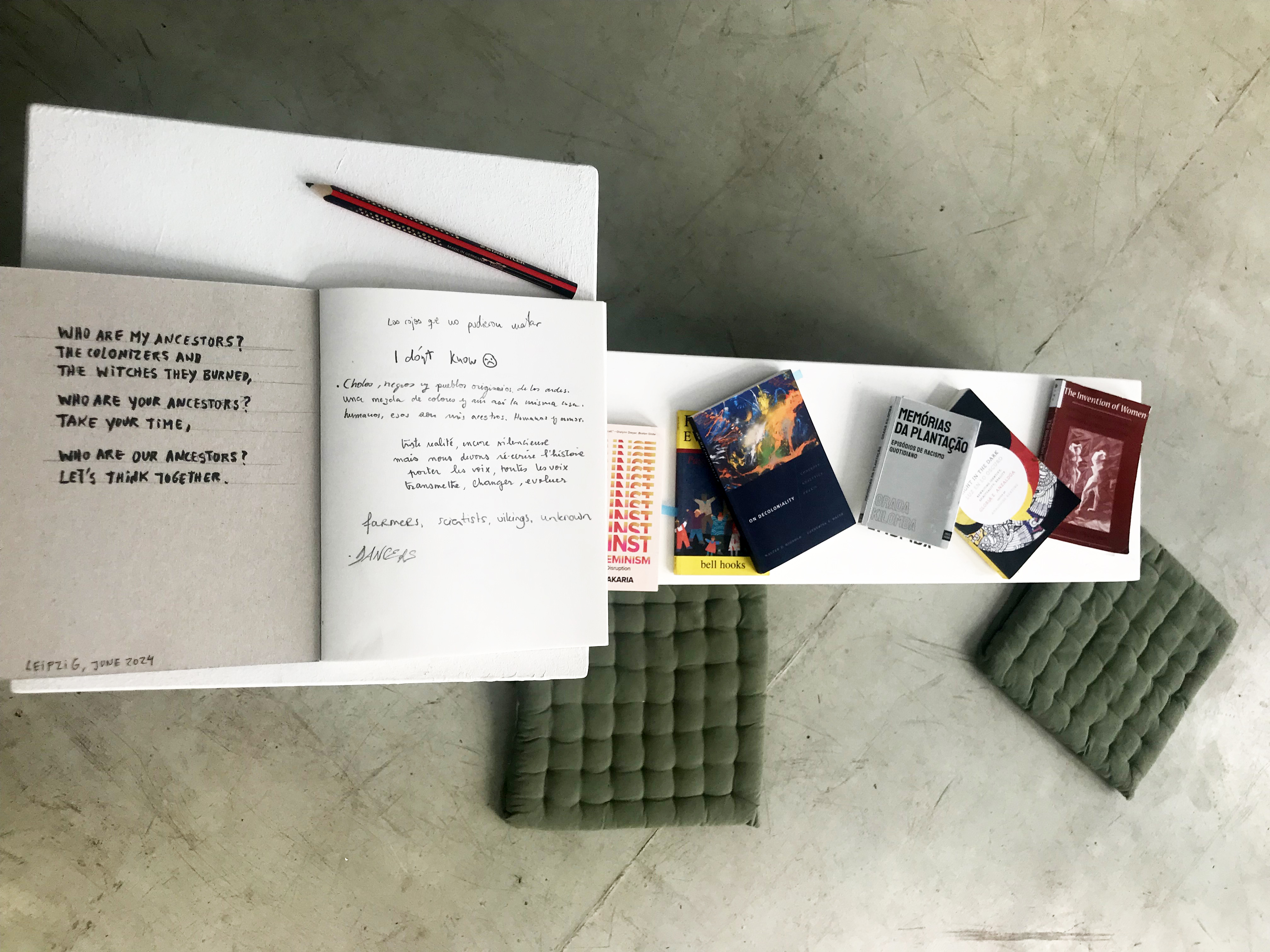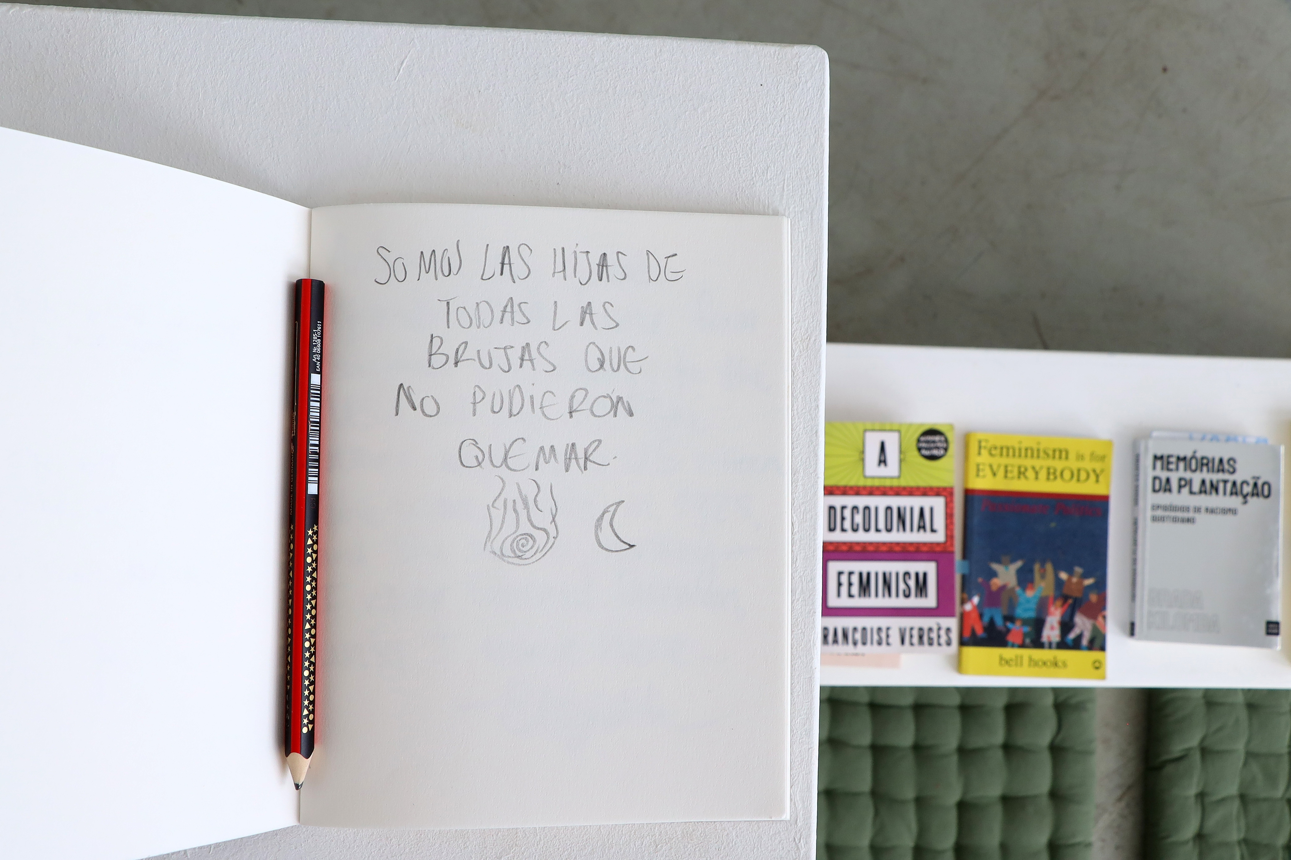 30 drawings (21 cm x 29,7 cm each) / soundtrack 1.42′ in loop / books from Audre Lorde, bell hooks, Catherine Walsh, Djamila Ribeiro, Françoise Vergès, Gloria Anzaldúa, Grada Kilomba, Oyèrónke Oyêwùmi, and Rafia Zakaria / notebook for collaborative participation